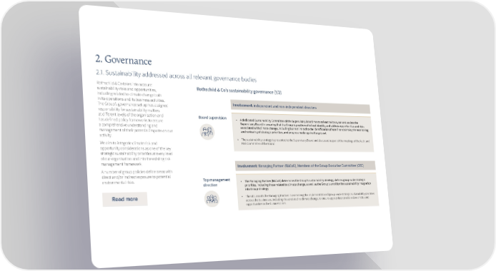 . Governance .. Sustainability addressed across all relevant governance bodies Rothschild & Co takes into account Rothschild & Co’s sustainability governance (/) ainability risks and opportunities, sust including related to climate change both in its operations and its business activities. Involvement: independent and non-independent directors The Group’s governance set-up has assigned responsibility for sustainability matters at different levels of the organisation and Board supervision ■ A dedicated Sustainability Committee of the Supervisory Board meets at least twice a year and assists the has defined policy frameworks to ensure Supervisory Board in ensuring that the Group is positioned to best identify, and address opportunities and risks a comprehensive understanding and associated with climate change, including but not limited to the identification of non-financial risks, the monitoring management of their potential impacts on our and reviewing of strategic priorities, and progress made against targets set activity. ■ The sustainability strategy is presented to the Supervisory Board and discussed as part of the meetings of the Audit and We aim to integrate climate risk and Risk Committee of the Board opportunity considerations as one of the key strategic sustainability priorities at every level of our organisation and into the existing risk management framework. Involvement: Managing Partner (R&CoG), Members of the Group Executive Committee (GEC) A number of group policies define areas with direct and/or indirect exposure to potential environmental risks. Top management ■ The Managing Partner (R&CoG) determines the Group’s sustainability strategy, defines group-wide strategic direction priorities, including those related to climate change, as well as the Group’s ambition for sustainability integration into Group strategy ■ The GEC assists the Managing Partner in overseeing the implementation of group-wide strategic sustainability priorities across the businesses, including those related to climate change, to ensure appropriate consideration of risks and opportunities in the business lines