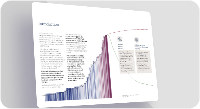 Introduction In 2021 and 2022, the informed decisions. That is Intergovernmental Panel on Climate why the Group supports the Change (IPCC) published its sixth recommendations of the Task assessment report on climate change, Force on Climate-related Financial reiterating the emergency related to Disclosures (TCFD) and aims to The risk of Global impact of the increased anthropogenic greenhouse continue to develop its assessment business transition to a low carbon gas emissions. of the potential impact of climate as usual economy International institutions and change on its business, and its supervisors also warn about the businesses’ impact on a changing According to the IPCC**, the Achieving the transformation potential disruption and impact climate. current trajectory of economic of the global economy to activity will lead to an increase reduce greenhouse gas that climate change can have on In this report, we would like in temperature that will impact emissions and their effect the global economy. The European to present the key elements economic players in their on the climate will require Central Bank identifies climate change constituting our strategy operations and throughout transformation of production as a key risk driver for the euro area to manage climate-related their value chain. and consumption patterns. banking system and recommends risks and seize opportunities Anticipating the consequences Identifying the impact on this is considered in business risk resulting from the low an increased temperature our clients’ and investee management processes*. carbon transition of the could have on our businesses companies’ markets and their and our clients will improve business models will be crucial Rothschild & Co recognises that global economy, as well our resilience and our ability to in the coming decades. climate-related physical and as the key actions we service clients. transition risks have the potential have taken so far with the to destabilise the global economy, aim to mitigate these risks leading to unexpected market for our business and our changes. stakeholders. We believe that improved climate disclosure can lead to better * https://www.bankingsupervision.europa.eu/ ** AR6, IPCC, 2022