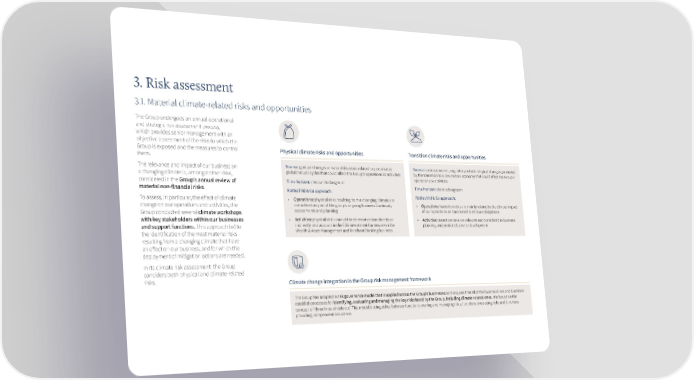 . Risk assessment .. Material climate-related risks and opportunities The Group undergoes an annual operational and strategic risk assessment process, which provides senior management with an objective assessment of the risks to which the Group is exposed and the measures to control Physical climate risks and opportunities Transition climate risks and opportunities them. The relevance and impact of our business on Source: gradual changes or natural disasters related to perturbated Source: socio-economic, regulatory or technological changes generated a changing climate is, amongst other risks, global natural cycles that could affect the Group’s operations or activities by the transition to a low-carbon economy that could affect the Group’s considered in the Group’s annual review of Time horizon: medium to long term operations or activities material non-financial risks. Rothschild & Co approach: Time horizon: short to long term To assess, in particular, the effect of climate ■ Operations: physical risks resulting from a changing climate are Rothschild & Co approach: change on our operations and activities, the considered as part of the group’s ongoing Business Continuity ■ Operations: transition risks are mainly related to the climate impact Group conducted several climate workshops assessments and planning of our operations and increased disclosure obligations with key stakeholders within our businesses ■ Activities: physical risk is one of the elements taken directly or ■ Activities: transition risks are relevant and considered in business and support functions. This approach led to indirectly into account in the ESG investment framework in the planning and product & service development the identification of the most material risks Wealth & Asset Management and Merchant Banking business resulting from a changing climate that have an effect on our business, and for which the deployment of mitigation actions are needed. In its climate risk assessment, the Group considers both physical and climate-related risks. Climate change integration in the Group risk management framework The Group has adopted a risk governance model that is applied across the Group’s businesses and requires that all of the business lines and functions establish processes for identifying, evaluating and managing the key risks faced by the Group, including climate-related ones. It is based on the concept of ‘three lines of defence’. This model distinguishes between functions owning and managing risks, functions overseeing risks and functions providing independent assurance.