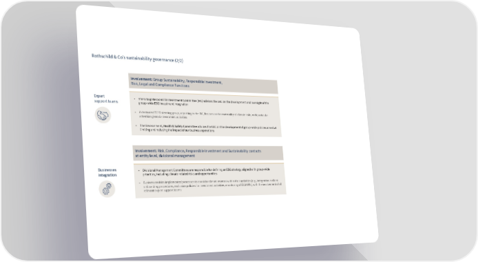 Rothschild & Co’s sustainability governance (/) Involvement: Group Sustainability, Responsible Investment, Risk, Legal and Compliance Functions Expert ■ The Group Responsible Investment Committee (RIC) advises the GEC on the development and oversight of the support teams group-wide ESG investment integration ■ A dedicated TCFD steering group, reporting to the RIC, focuses on the materiality of climate risks, with particular attention given to investment activities ■ The Environment, Health & Safety Committee advises the GEC on the development of group-wide policies aimed at limiting and reducing the impact of our business operations Involvement: Risk, Compliance, Responsible Investment and Sustainability contacts at entity level, divisional management Businesses ■ Divisional Management Committees are responsible for defining an ESG strategy aligned with group-wide integration priorities, including climate-related risks and opportunities ■ Business entities implemented processes to consider climate matters within their activities (e.g., integration in client onboarding procedures, exclusion policies for investment activities, monitoring of ESG KPIs), with the involvement of all relevant expert support teams