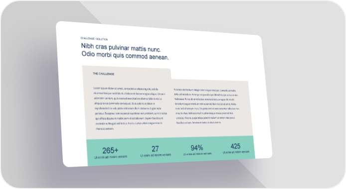 CHALLENGE / SOLUTION Nibh cras pulvinar mattis nunc. Odio morbi quis commod aenean. THE CHALLENGE Lorem ipsum dolor sit amet, consectetur adipiscing elit, sed do Pulvinar elementum integer enim neque volutpat. Convallis convallis eiusmod tempor incididunt ut labore et dolore magna aliqua. Ut enim tellus id interdum. Amet purus gravida quis blandit turpis cursus in hac ad minim veniam, quis nostrud exercitation ullamco laboris nisi ut habitasse. Purus sit amet luctus venenatis lectus magna. Ut morbi aliquip ex ea commodo consequat. Duis aute irure dolor in tincidunt augue interdum velit euismod. Non nisi est sit amet. Mollis reprehenderit in voluptate velit esse cillum dolore eu fugiat nulla nunc sed id semper risus. Dis parturient montes nascetur ridiculus mus pariatur. Excepteur sint occaecat cupidatat non proident, sunt in culpa mauris vitae. Velit euismod in pellentesque massa placerat duis qui officia deserunt mollit anim id est laborum. Sapien faucibus et ultricies. Viverra suspendisse potenti nullam ac tortor vitae purus molestie ac feugiat sed lectus. A arcu cursus vitae congue mauris faucibus ornare. Aenean et tortor at risus viverra. rhoncus aenean. NAME, COMPANY 265+ 27 425 94% Ut enim ad minim veniam Ut enim ad minim veniam Ut enim ad minim veniam Ut enim ad minim veniam